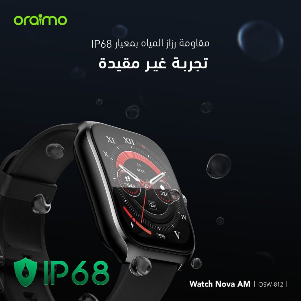 وتتسم ساعة Watch Nova AM الذكية بأعلى معايير المقاومة للماء والغبار IP68 وهو من أعلى المعايير العالمية في هذا المجال ، حيث خضعت ساعة أورايمو للعديد من الاختبارات الصارمة في مقاومة الغبار حتى انها تصلح للبيئة الصحراوية وتتحمل درجات الحرارة المرتفعة ، بجانب مقاومتها للماء ما يجعلها ساعة عملية تتوافق مع مختلف بيئات العمل ومختلف أنواع الرياضات.