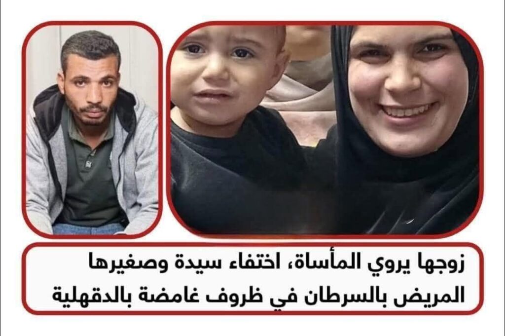 ناشد شاب بقرية الطيبه بمركز نبروه بمحافظة الدقهلية الجهات المعنية لمساعدته في العثور على زوجتة وابنه الصغير بعد اختفائهما في ظروف غامضة أثناء توجههما إلى أحد المستشفيات بالمحافظة.