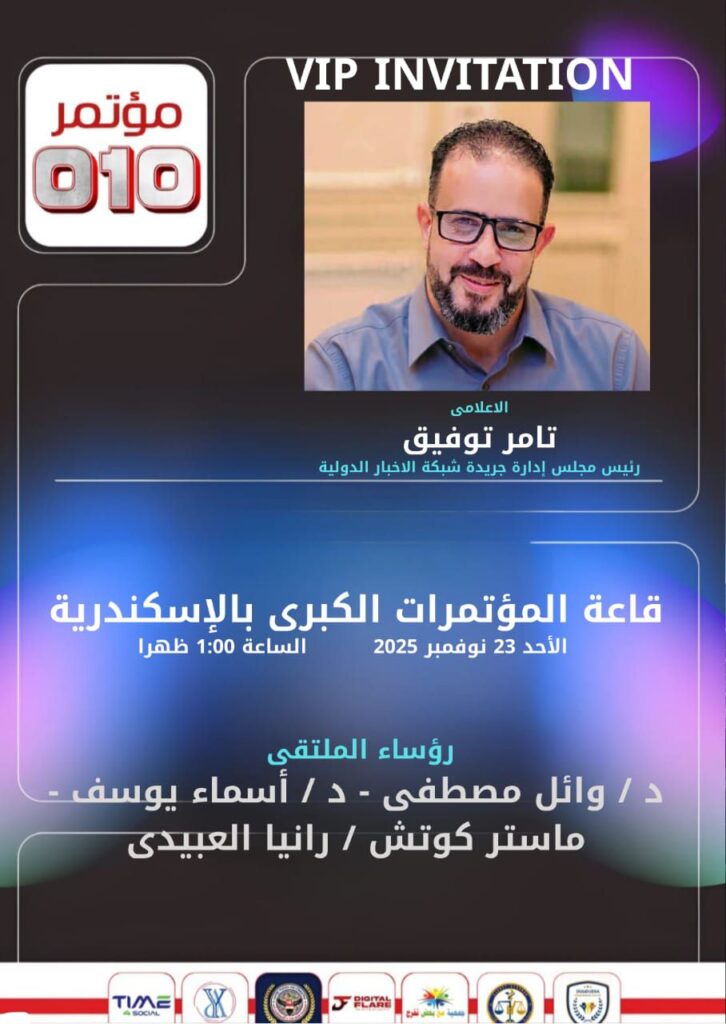 في إطار الاهتمام بتطوير مهارات الكوادر المصرية وتعزيز دور المنصات التدريبية في بناء الإنسان، يشارك الإعلامي تامر توفيق، رئيس مجلس إدارة جريدة شبكة الأخبار الدولية، كضيف شرف VIP في فعاليات مؤتمر 010، والمقرر انعقاده يوم الأحد 23 نوفمبر 2025 داخل قاعة المؤتمرات الكبرى بالإسكندرية في تمام الساعة 1:00 ظهرًا.