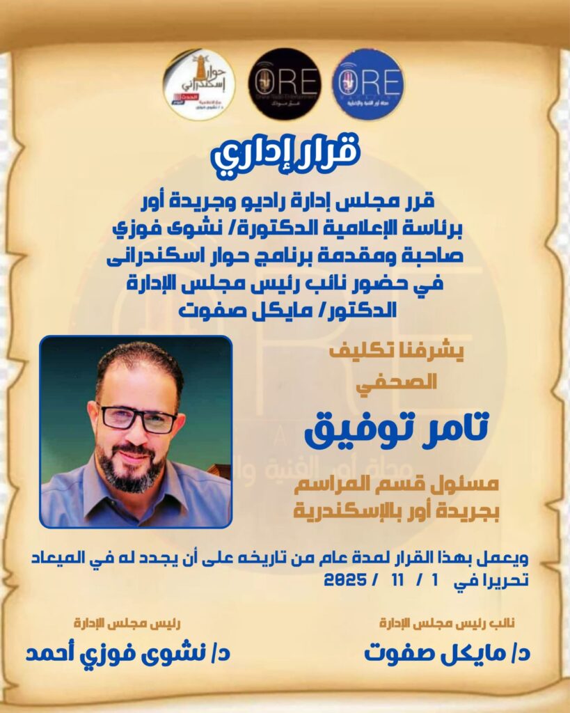 ووجّه تامر توفيق شكرًا خاصًا إلى الدكتورة نشوى فوزي، رئيس مجلس إدارة مجموعة أور الإعلامية ومقدمة برنامج حوار إسكندراني على قناة “هي”، تقديرًا لدعمها المتواصل وجهودها في تطوير المنظومة الإعلامية بالمجموعة، وحرصها المستمر على اختيار الكفاءات الفاعلة في العمل الإعلامي.