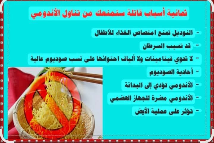 يعتبر الاندومي من المأكولات الكارثية حيث يتسبب في العديد من حالات الوفيات والإصابة بالأمراض الخطيرة
