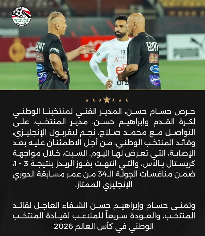 ” حرص حسام حسن المدير الفني لمنتخبنا الوطني لكرة القدم ،وإبراهيم حسن مدير المنتخب على التواصل مع محمد صلاح نجم ليفربول الإنجليزي وقائد المنتخب الوطني من أجل الإطمئنان عليه بعد الإصابة التي تعرض لها السبت خلال مواجهة كريستال بالاس، والتي إنتهت بفوز الريدز بنتيجة 3 – 1، ضمن منافسات الجولة 34 من عمر مسابقة الدوري الإنجليزي الممتاز .