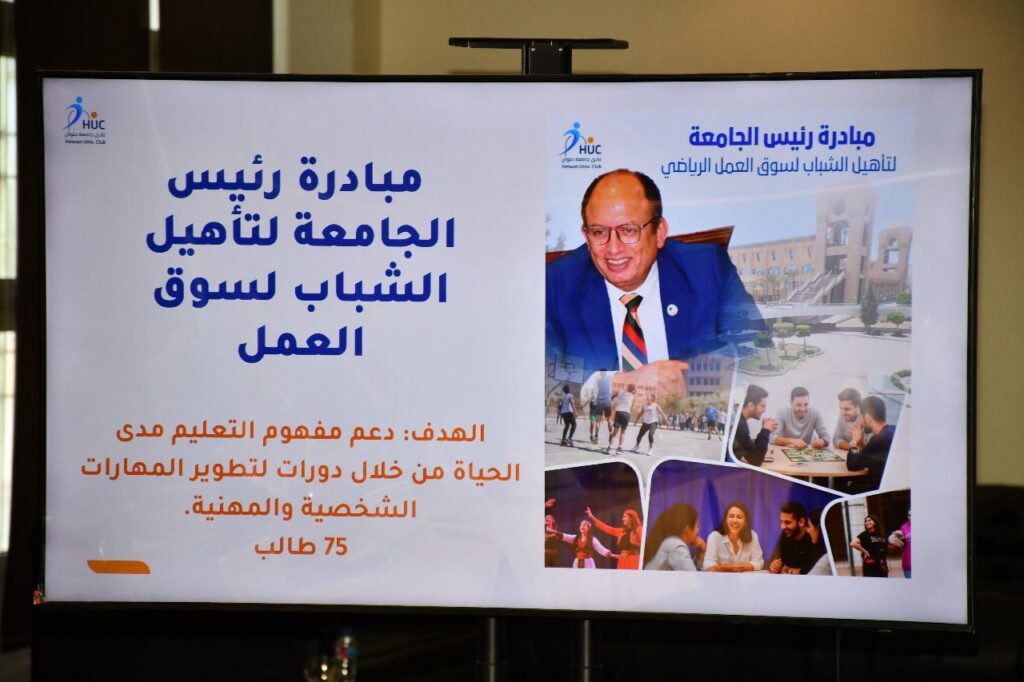 كما تم عرض الأنشطة الطلابية والتدريبية منها دورة مدير الفعاليات الرياضية، دورة المدرب الشخصي، دورة تخطيط الموسم التدريبي في كرة القدم، دورة محلل الآداء في كرة القدم، تنظيم ورش عمل ومحاضرات لرفع الوعي الصحي والنفسي، التعاون مع كليات الجامعة لتوفير تدريبات صيفية للطلاب، مشروع مبادرة نادى جامعة حلوان لاكتشاف المواهب الرياضية، مبادرة دورات تنمية المهارات الدعم التعليم مدى الحياة.