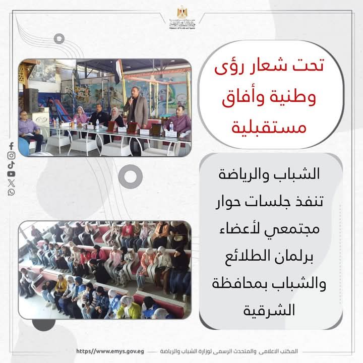 ضمن مشروع القادة البرلمانيون،، نفذت وزارة الشباب والرياضة – الإدارة المركزية للبرلمان والتعليم المدني، جلسات حوار مجتمعي لأعضاء برلمان الطلائع والشباب بمحافظة الشرقية، بهدف تعزيز الوعي المجتمعي وترسيخ قيم المشاركة الإيجابية بين النشء والشباب أعضاء نماذج محاكاة الحياة السياسية المصرية” برلمان الطلائع والشباب والشيوخ واتحاد بشبابها” .