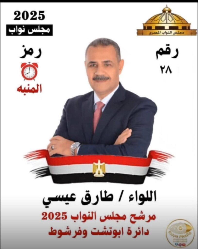 يتقدّم الشيخ طارق نبهان عبدالقوي فؤاد بخالص التقدير والاحترام إلى اللواء طارق عيسى، دعمًا لمسيرته المشرّفة وتاريخه الوطني النقي، وثقةً في قدرته على تمثيل أبناء أبوتشت وفرشوط خير تمثيل تحت قبة البرلمان.