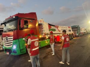 أعلن الهلال الأحمر أن قافلة “زاد العزة..من مصر إلى غزة” التي شرعت بالدخول للشعب الفلسطيني في قطاع غزة في يومها الـ37، تحمل أكثر من 2500 طن من المساعدات الغذائية والطبية والإغاثية في اتجاه جنوب القطاع، من البوابة الفرعية لميناء رفح البري بشمال سيناء باتجاه معبر كرم أبو سالم جنوب شرق القطاع، حيث تخضع الشاحنات للتفتيش من قبل قوات الاحتلال الإسرائيلي قبل أن تدخل إلى الفلسطينيين بالقطاع.