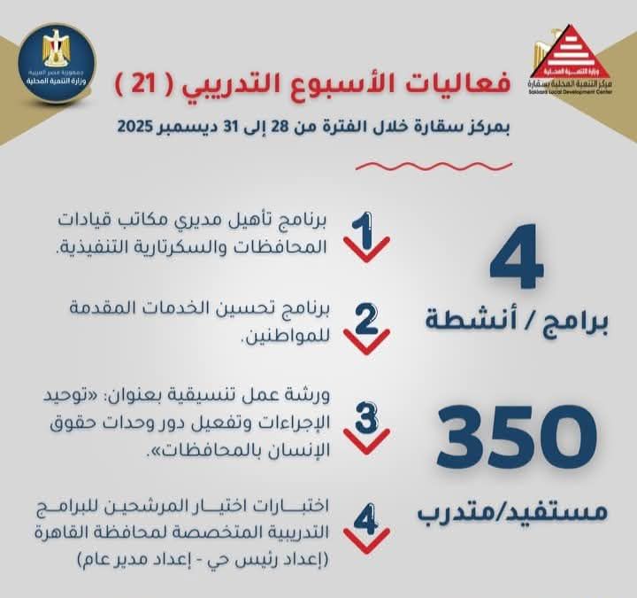 انطلاق الأسبوع التدريبي الحادي والعشرين بمركز سقارة بمشاركة 350 متدربًا من المحافظات