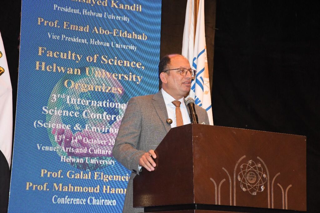 وفي كلمة الدكتور عماد أبو الدهب نائب رئيس الجامعة للدراسات العليا والبحوث رحب بالسادة الحضور في المؤتمر العلمي الرائد الذي تنظمه كلية العلوم تحت عنوان “العلم والبيئة”. وأشار إلى إن هذا الحدث يأتي في وقت حاسم تتطلب فيه تحديات البيئة منا وقفة جادة وتفكيرا معمقا، لا سيما مع التغيرات المناخية والتدهور البيئي، واستنزاف الموارد الطبيعية، وهو مايناقشه هذا الحدث العلمي الهام الذي يفتح آفاقا واسعة للحوار والتعاون، ويؤكد على الدور المحوري الذي تلعبه العلوم في دعم مسارات التنمية المستدامة، وصياغة حلول حقيقية للتحديات البيئية والاجتماعية، وأوضح أن هذا المؤتمر ثمرة الجهود مكثفة بذلتها كلية العلوم بجامعة حلوان، إيمانًا منها بأهمية تفعيل دور المؤسسات الأكاديمية في خدمة المجتمع، وتحفيز البحث العلمي القائم على الابتكار والاستجابة الفعالة لقضايا الساعة.