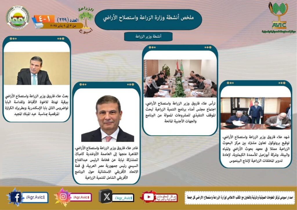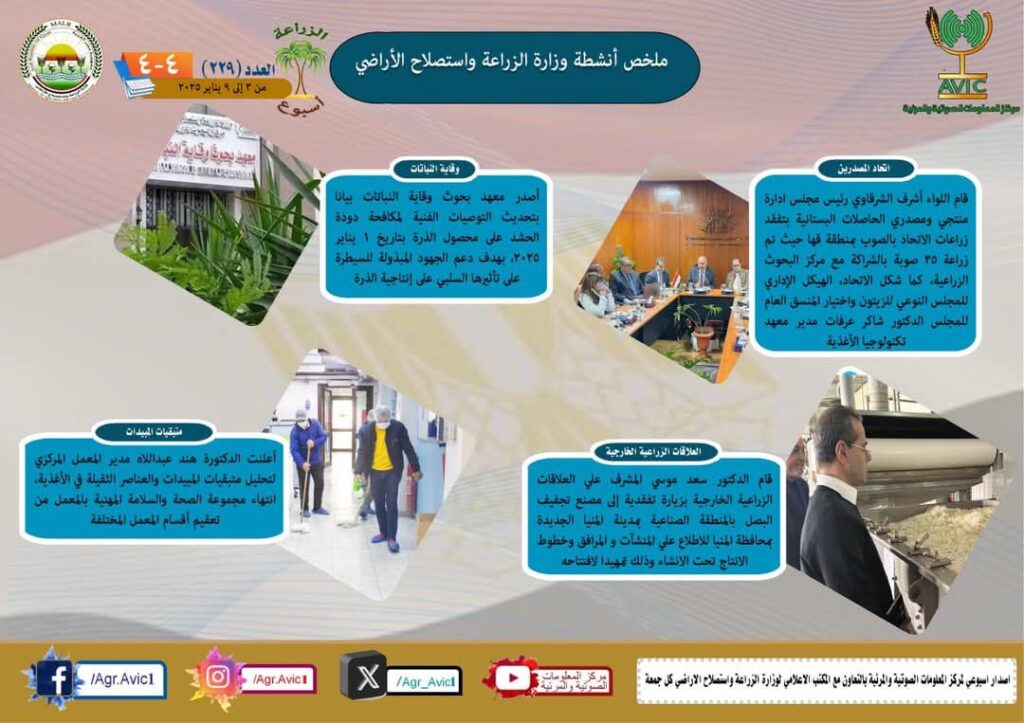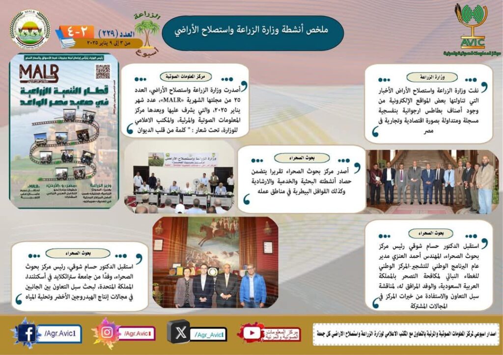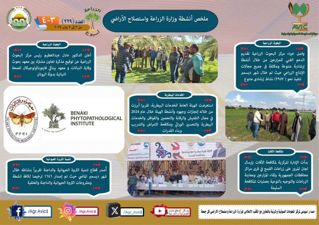 بالانفوجراف والفيديو| “الزراعة في أسبوع” نشرة الحصاد رقم ٢٢٩ لأنشطة الوزارة في الفترة من ٣ وحتى ٩ يناير الجاري