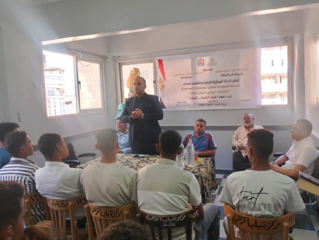 اللقاء، الذي جاء برعاية الدكتور أشرف صبحي وزير الشباب والرياضة، والدكتور خالد عبد الحليم محافظ قنا، وتوجيهات بهاء شوقي وكيل وزارة الشباب والرياضة بالمحافظة، استهدف رفع الوعي السياسي لدى الشباب وتعزيز ثقافة المشاركة الإيجابية في العملية الانتخابية باعتبارها دعامة أساسية للديمقراطية وبناء الوطن.