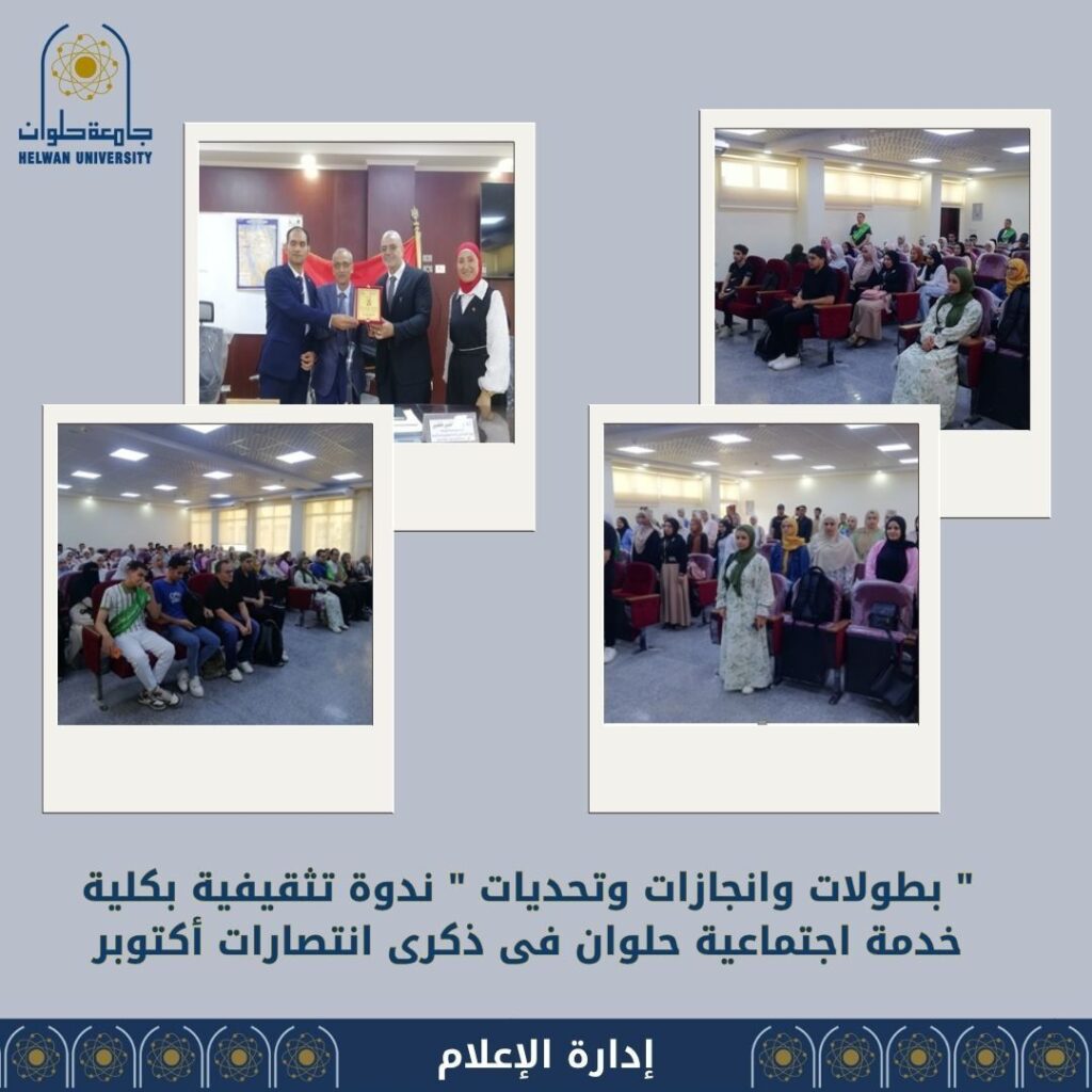 نظمت كلية الخدمة الاجتماعية ندوة تثقيفية كبري بعنوان ” بطولات وانجازات وتحديات ” وذلك تحت رعاية الدكتور السيد ابراهيم قنديل رئيس الجامعة ، الدكتور وليد محمد السروجى نائب رئيس الجامعة لشئون خدمة المجتمع وتنمية البيئة ، و الدكتور زغلول عباس حسنين عميد كلية الخدمة الاجتماعية ، وبإشراف الدكتورة صفاء خضير خضير قائم بعمل وكيل الكلية لشئون خدمة المجتمع وتنمية البيئة.