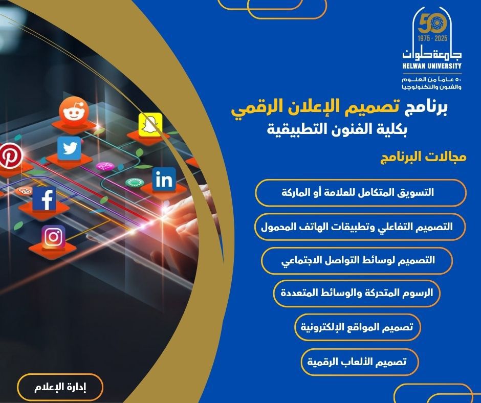 أعلنت جامعة حلوان عن تفاصيل برنامج تصميم الإعلان الرقمي بـ كلية الفنون التطبيقية، فهو برنامج يهدف إلى تخريج مصمم إعلان رقمي قادر على تقديم الحلول المتكاملة للمشكلات التصميمية في هذا المجال من خلال تطبيق استراتيجيات الإبداع والتقنيات مع توظيف العلوم المرتبطة بما يحقق المراقبة للمتغيرات الحديثة وتلبية احتياجات سوق العمل في ضوء أخلاقيات المهنة.