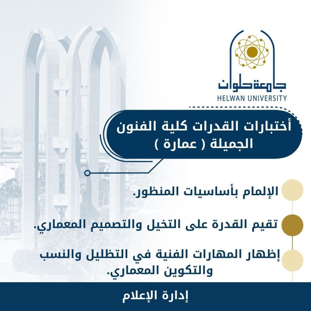 بعد إعلان وزارة التعليم العالي والبحث العلمي برئاسة الدكتور أيمن عاشور عن مواعيد اختبارات القدرات أوضحت كلية الفنون الجميلة بالزمالك – جامعة حلوان، تفاصيل اختبارات القدرات لطلاب الثانوية العامة الراغبين في الالتحاق بقسم “العمارة”، والتي تُعد شرطًا أساسيًا للقبول بالكلية، والتي تقام تحت رعاية الدكتور السيد قنديل رئيس جامعة حلوان ورئيس اللجنة العليا لاختبارات القدرات، والدكتور حسام رفاعي نائب رئيس الجامعة لشئون التعليم والطلاب، وريادة الدكتور عمرو سامي عميد كلية الفنون الجميلة.