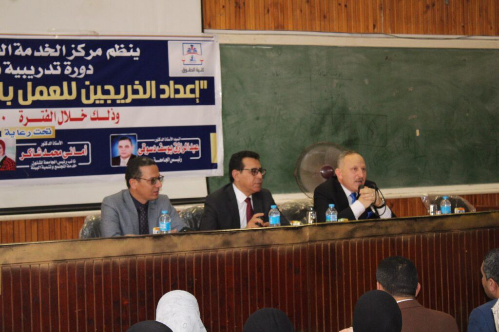 في إطار رؤية مصر 2030م، وفي ظل التأكيد الدائم لفخامة السيد الرئيس عبد الفتاح السيسي رئيس الجمهورية، علي حتمية الاهتمام ببناء الانسان المصري، قام مركز الخدمة العامة بجامعة كفرالشيخ بتنظيم دورة تدريبية بعنوان “إعداد الخريجين للعمل بالهيئات القضائية” بالتعاون مع كلية الحقوق جامعة كفرالشيخ، وذلك تحت رعاية الدكتور عبدالرازق دسوقي رئيس جامعة كفر الشيخ، والدكتور أماني شاكر نائب رئيس الجامعة لشئون خدمة المجتمع وتنمية البيئة، والدكتور ماهر أبوخوات عميد كلية الحقوق، واشراف تنفيذي للدكتور ابراهيم الطحان مدير مركز الخدمة العامة بالجامعة، والدكتور مصطفي صبحي منسق أنشطة مركز الخدمة العامة بكلية الحقوق.
