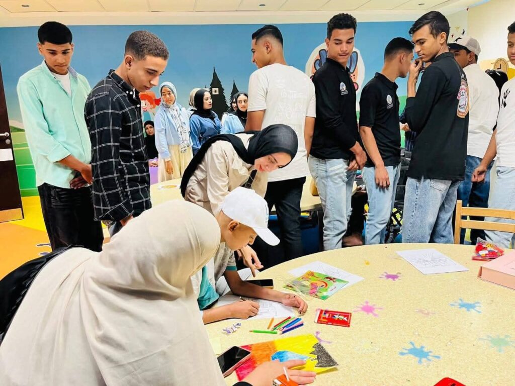 وذلك لرسم البسمة على وجوه نزلاء المستشفى وتخفيف الألم عنهم من خلال ادخال البهجة والسرور عليهم بعد قضاء وقت ممتع معهم لدعمهم معنويًا.