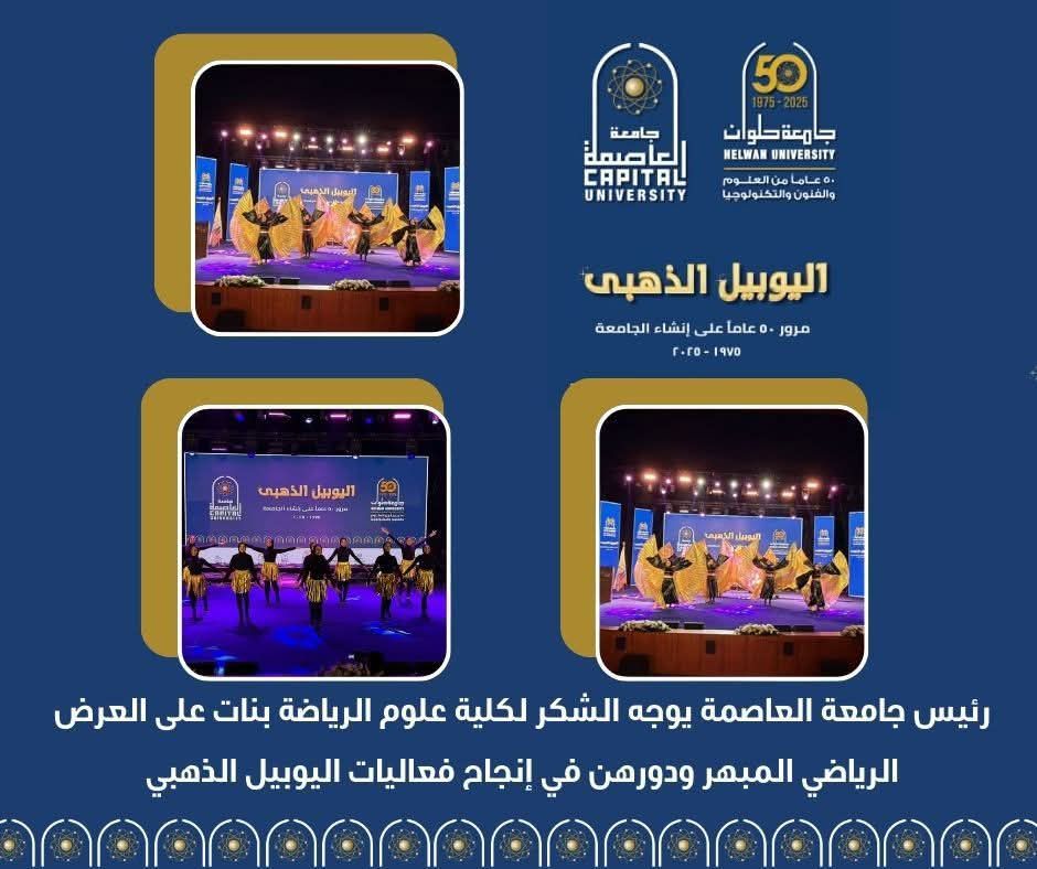 في إطار احتفالات جامعة حلوان باليوبيل الذهبي ومرور خمسين عامًا على مسيرتها العلمية والفنية والتكنولوجية، وجّه الدكتور السيد قنديل رئيس جامعة العاصمة، خالص الشكر والتقدير إلى كلية علوم الرياضة بنات على ما قدّمته من عرض فني رياضي مبهر خلال الفعاليات الرسمية للاحتفالية، والذي عُرض بمجمع الفنون والثقافة.