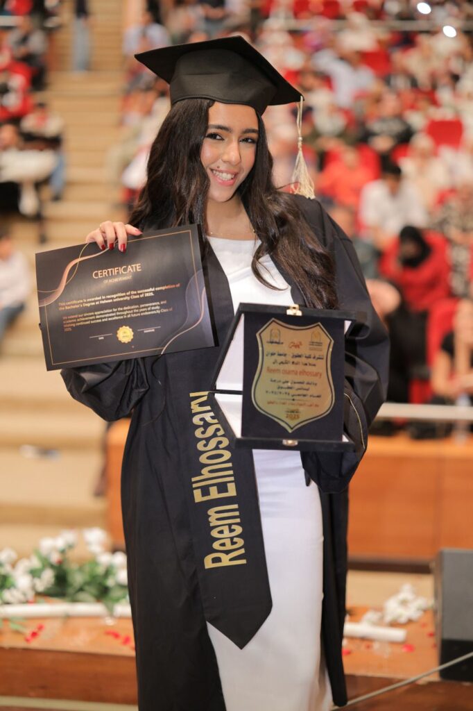 وقالت:أتوجّه بخالص التقدير إلى شركة جامعة حلوان لدعم الخدمات التعليمية بقيادة الدكتور محمود حامد، الذين أضفوا على الحفل طابعًا راقيًا وتنظيمًا يعكس روح جامعة حلوان وقيمها. لقد صنعتم يومًا سيبقى في ذاكرة أبنائنا الخريجين بكل تفاصيله الجميلة.”