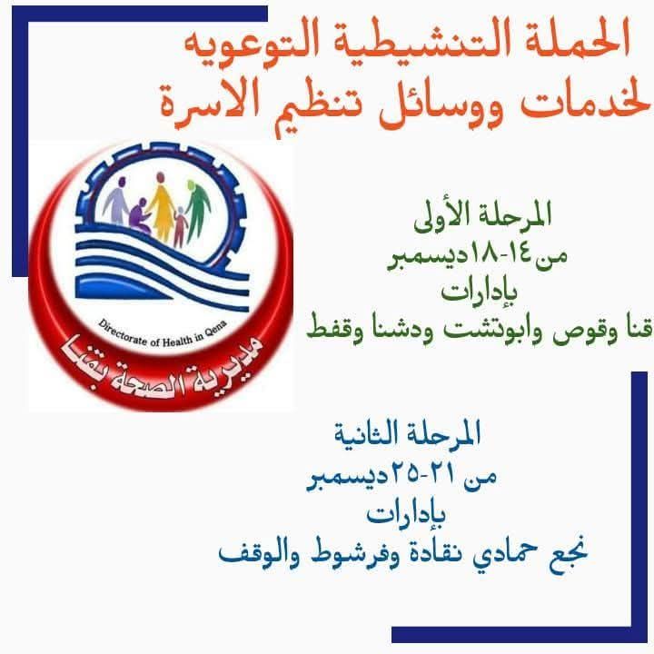 تنطلق بمحافظة قنا فعاليات الحملة التنشيطية للتوعية وتنظيم الأسرة، في إطار مبادرة فخامة رئيس الجمهورية “بداية”، وتحت شعار “مشوار الألف الذهبية يبدأ بخطوة”.