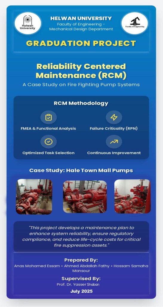 فى إطار تشجيع طلاب جامعة حلوان على إظهار قدراتهم وربط الجانب الاكاديمى بالواقع، نفذ مجموعة من طلاب كلية هندسة المطرية مشروع تخرج متميز بعنوان “Reliability-Centered Maintenance الصيانة المعتمدة على الموثوقية”، وذلك تحت رعاية الدكتور السيد قنديل رئيس الجامعة والدكتور عمرو عبد الهادى عميد هندسة المطرية، وإشراف الدكتور ياسر شعبان أستاذ التصميم الميكانيكى ونخبة من أعضاء هيئة التدريس والهيئة المعاونة.