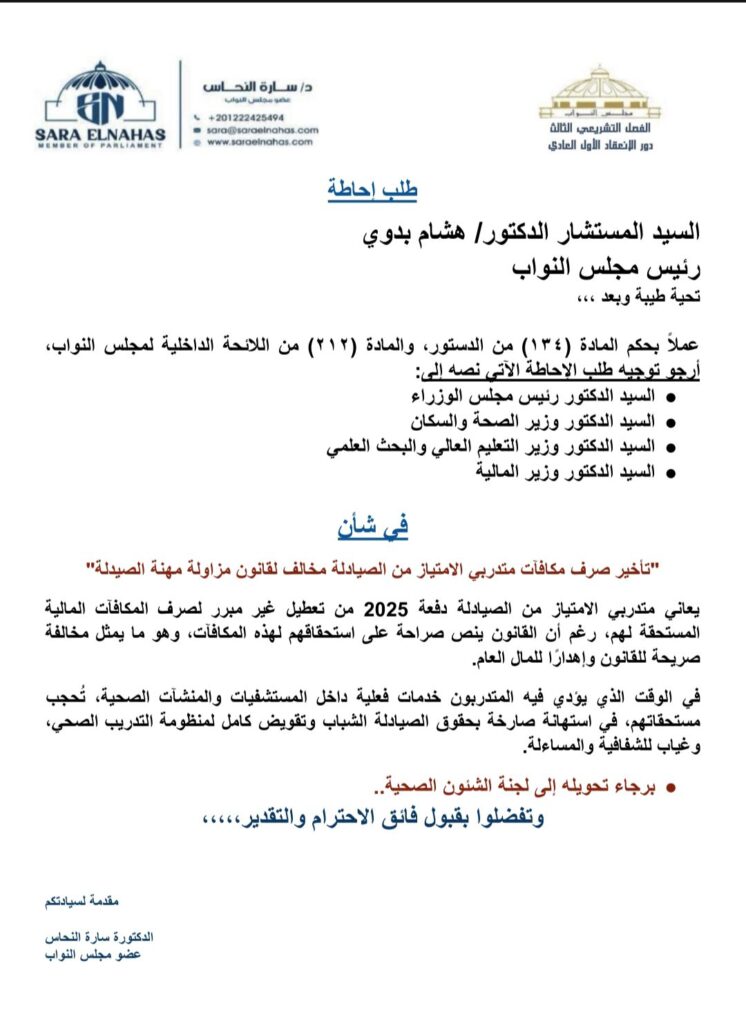 وحذر مقدمو الإحاطة من أن استمرار هذا النهج قد يؤدي إلى إحباط الكوادر الصيدلانية الجديدة، ويؤثر سلبًا على جودة التدريب والخدمات الصحية المقدمة للمواطنين، مطالبين بسرعة التدخل لحسم الأزمة وصرف المستحقات المتأخرة، ومحاسبة المسؤولين عن هذا التقصير.