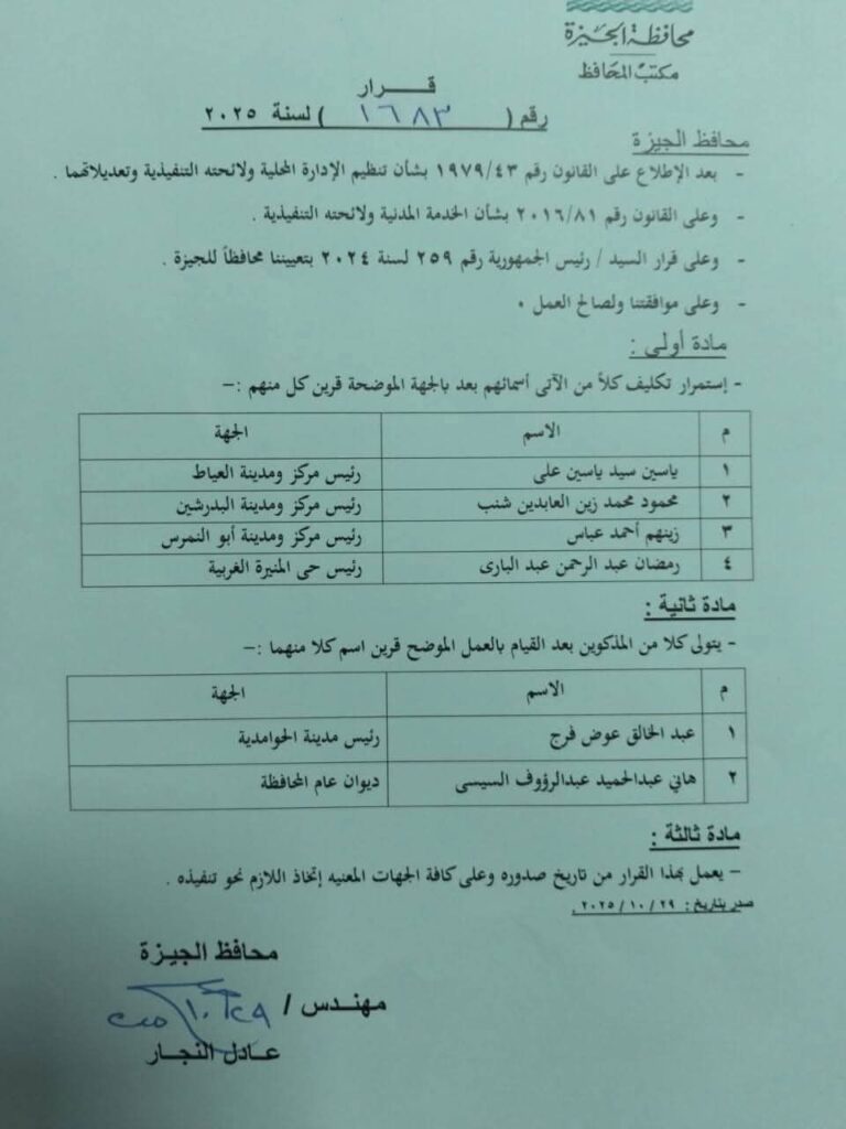 في خطوة مفاجئة أعقبت إعلان وزيرة التنمية المحلية لحركة قيادات المحليات الأخيرة، أصدر المهندس عادل النجار محافظ الجيزة القرار رقم 1683 لسنة 2025، متضمنًا حركة محدودة داخل المحافظة شملت عددًا من رؤساء المراكز والمدن والأحياء.