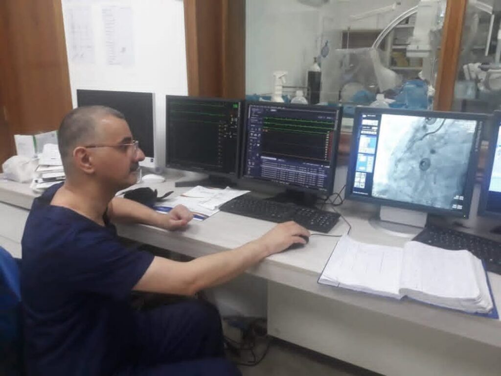 وذكر رئيس الفريق الطبي الدكتور أرشد فؤاد رضا: راجع المريض البالغ من العمر65 عاماً العيادة الاستشارية يعاني من صعوبة في التنفس واختناق أثناء النوم ، أجريت له جميع الفحوصات السريرية والمختبرية وكانت فحوصات تخطيط القلب والايكو تشير الى وجود ارتجاف أذيني وعجز القلب الشديد بنسبة 30% ، تم اجراء عملية القسطرة وتبين وجود تضيق شديد في الشريان الأيسر النازل للقلب وتم معالجة الحالة بوضع شبكة دوائية وكذلك معالجة الارتجاف الأذيني من خلال القسطرة الكهربائية وتمت متابعة حالته الصحية واستقرارها ، وبعد 4 أشهر من المتابعة استقرت حالة المريض الصحية وارتفع معدل كفاءة القلب من نسبة  30% الى 67% وبدون اي أعراض لقصور الشرايين .