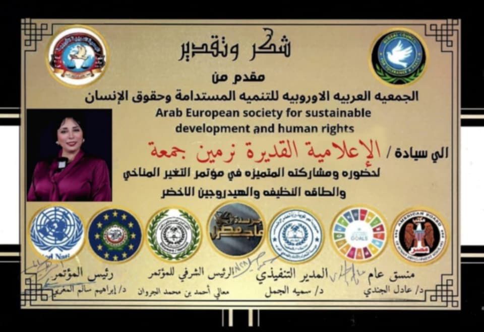 من جانبها، أعربت الإعلامية د. نرمين جمعة عن تقديرها لهذا التكريم، مؤكدة أن الإعلام لم يعد مجرد ناقل للأحداث، بل شريك فاعل في صناعة الوعي البيئي، مشددة على ضرورة تكثيف الخطاب الإعلامي المتخصص بقضايا المناخ والطاقة النظيفة خلال المرحلة المقبلة، بما يواكب التحديات العالمية ويخدم مسار التنمية المستدامة.