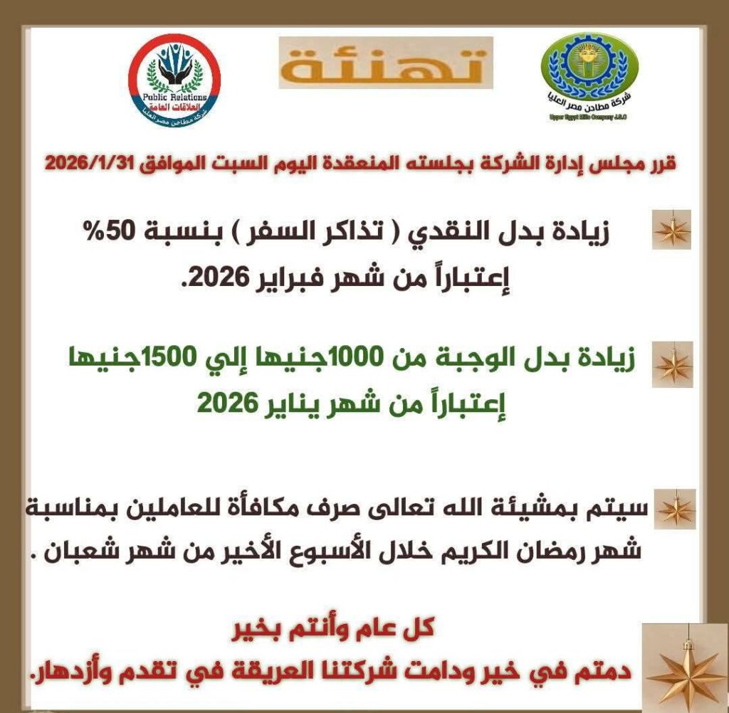 قرر مجلس اداره شركه مطاحن مصر العليا بحلسته المنعقده امس السبت باسوان زياده بدل النقدي بنسبه 50بالمائه اعتبارا من شهر فبراير وزياده بدل الوجبه من 1000ج الي 1500ج اعتبارا من يناير وصرف مكافاه للعاملين بمناسبه حلول الشهر الكريم علي أن تصرف المنحه اخراسبوع في شهر شعبان المبارك