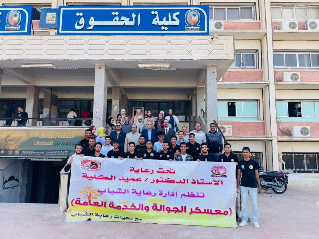 نفذ طلاب كلية الحقوق بجامعة جنوب الوادي ، ورعاية الشباب بالكلية، وطلاب من أجل مصر معسكرًا للخدمة العامة برعاية الدكتور أحمد عكاوي عبد العزيز، رئيس الجامعة، والدكتور محمد سعيد ، نائب رئيس الجامعة لشئون خدمة المجتمع وتنمية البيئه ، والدكتور أشرف موسى ، نائب رئيس الجامعة لشئون التعليم والطلاب والدكتور عبد الباري سليمان، عميد الكلية، وبحضور الدكتور أبو الحمد مصطفى عميد كلية التجارة والدكتور صدام حسين وكيل كلية التجارة لشئون التعليم والطلاب، وبإشراف الدكتور عباس مصطفى عباس وكيل الكلية لشئون التعليم والطلاب.