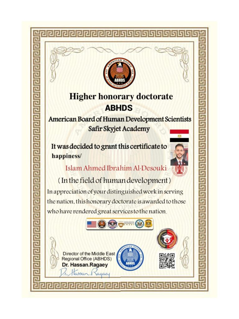 منح كابتن إسلام أحمد درجة الدكتوراه الفخرية العليا من المجلس الامريكي لعلماء التنميه البشريه