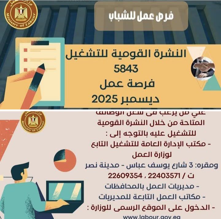 وبيّنت الوزارة أن التقديم على هذه الفرص يتم خلال شهر ديسمبر 2025 عبر الإدارة العامة للتشغيل بمقر الوزارة القديم بمدينة نصر، أو من خلال مديريات العمل بالمحافظات، كما يمكن التقديم مباشرة من خلال بيانات الشركات المرفقة بالنشرة، أو عبر الموقع الرسمي لوزارة العمل على شبكة الإنترنت… وأشارت الوزارة إلى أن نشرة التوظيف نصف الشهرية تُصدر بانتظام كل 15 يومًا من خلال الإدارة العامة للتشغيل برئاسة هبة أحمد، وإعداد منى شوقي – باحث أول بالإدارة، وتتضمن أحدث فرص العمل المتاحة في المحافظات..وأكدت الوزارة أن النشرة تتضمن مجموعة من الوظائف المخصصة لذوي الهمم، تنفيذًا لأحكام القانون رقم 10 لسنة 2018 بشأن حقوق الأشخاص ذوي الإعاقة، الذي يُلزم المنشآت بتخصيص نسبة 5% من إجمالي عمالها لهذه الفئة. ويأتي ذلك ضمن خطة الوزارة لحصر وتدريب وتشغيل ذوي الهمم ودمجهم في سوق العمل، تنفيذًا لتوجيهات فخامة الرئيس عبدالفتاح السيسي، رئيس الجمهورية، بتمكينهم اقتصاديًا ومجتمعيًا، وتوفير فرص عمل لائقة تُحقق لهم الدمج الكامل والمستدام.
