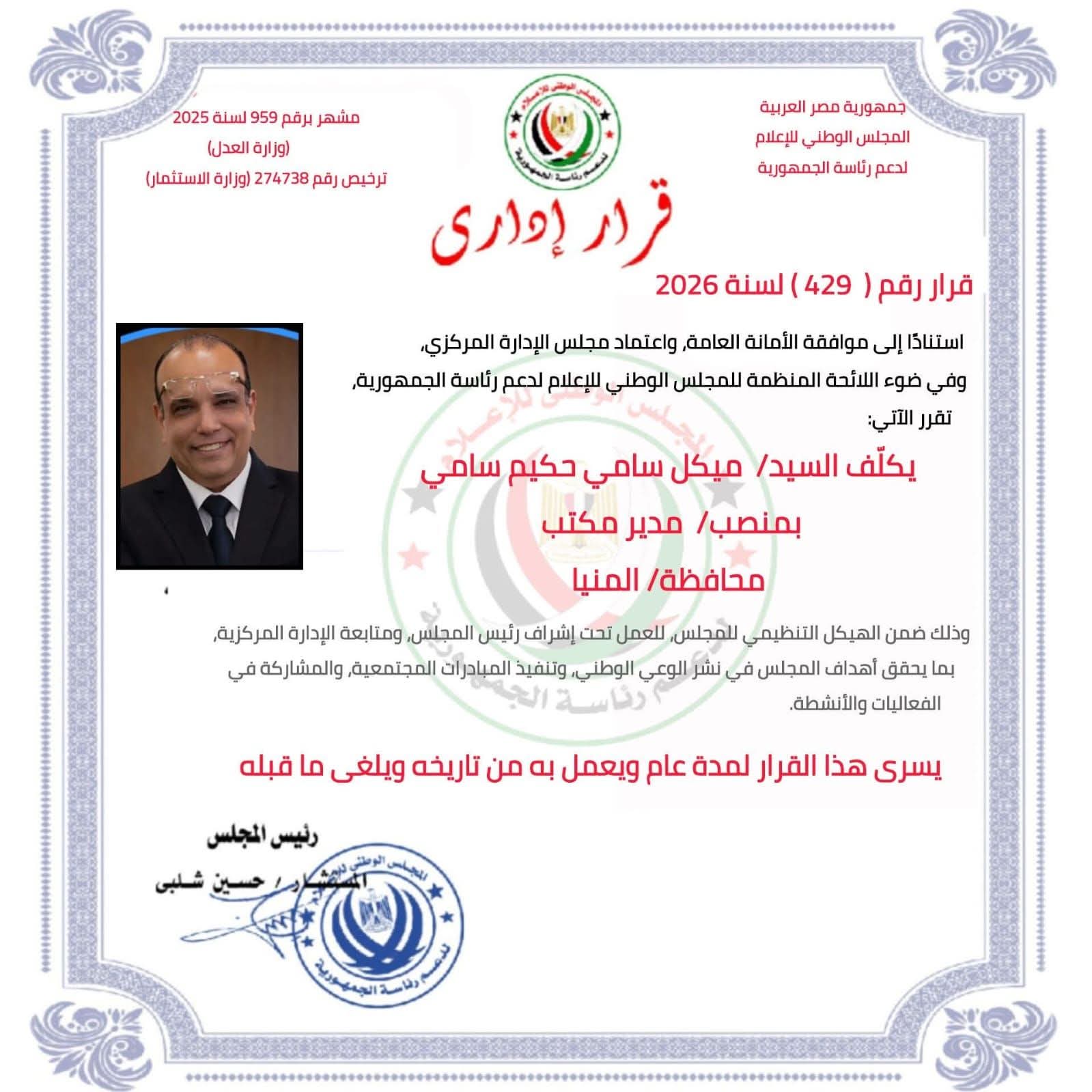 الدكتور مايكل سامي حكيم مديرًا لمكتب المجلس الوطني للإعلام لدعم رئاسة الجمهورية لمحافظة المنيا